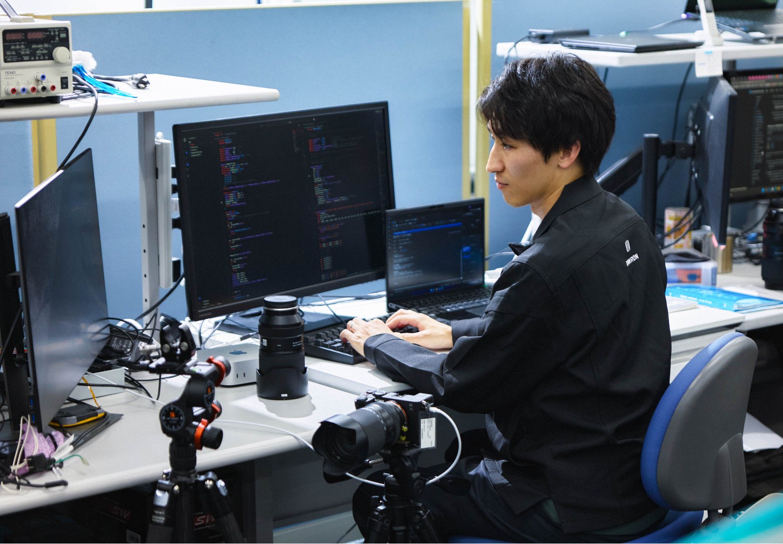 最も印象に残っているのは、入社1年目から写真用交換レンズに搭載される手振れ補正の機能開発に携われたことです。研究開発職を希望して入社したこともあり、元々早い段階から新製品の開発業務に携わりたいと声は挙げていました。最初は様々なプログラミングを作成しては社内でプレゼンを行う日々でしたが、1年目のある日、当時の上司に呼び出され新製品の機能開発担当を任せてもらえることになりました。「いずれは!」と思っていましたが、自分の想像以上に早いタイミングで任せていただいたことは今でも印象に残っています。とはいえ、まだまだ経験の少ない1年目の身。苦労する場面も多々あったのが正直なところです。ですが、周りの先輩方や上司のサポートもあり無事に開発業務を終えることができました。その後製品が発売され、店頭で見かけたりユーザーのレビューを見た時には、「自分が作った物が世に出てたくさんの人に使われているんだなぁ」と感慨深くなったことも覚えています。