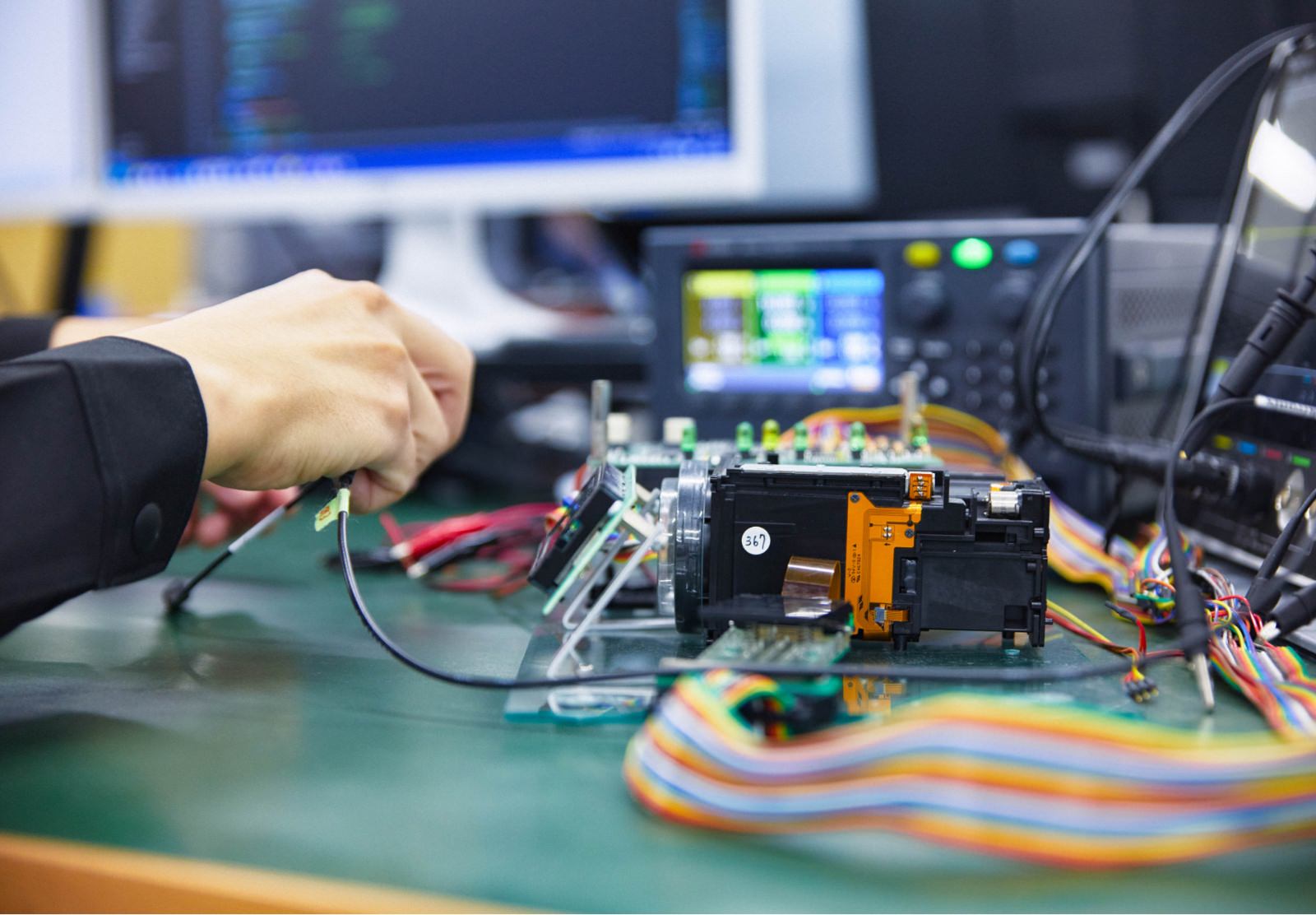 そして、他技術者が担当する光学系の設計やメカ部分の設計も揃った段階で試作品を組み立て、検証・評価を通して問題点の抽出・解析・対策を進めます。この段階になると、生産工場に向けた製品検査工程の作業指導や引き継ぎ、工場で用いる検査装置の動作確認など、生産技術的な役割も担います。