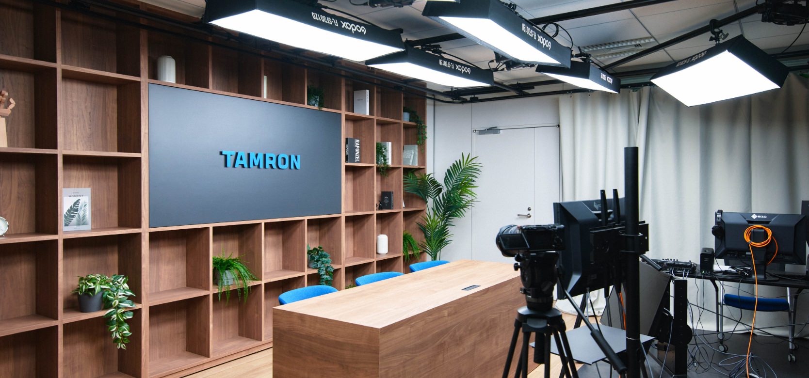社内外に向けたコンテンツ制作等で利用するスタジオを備えています。タムロンのロゴがあしらわれたセットや、映像・写真用のプロ機材を揃えており、さまざまな撮影に対応しています。