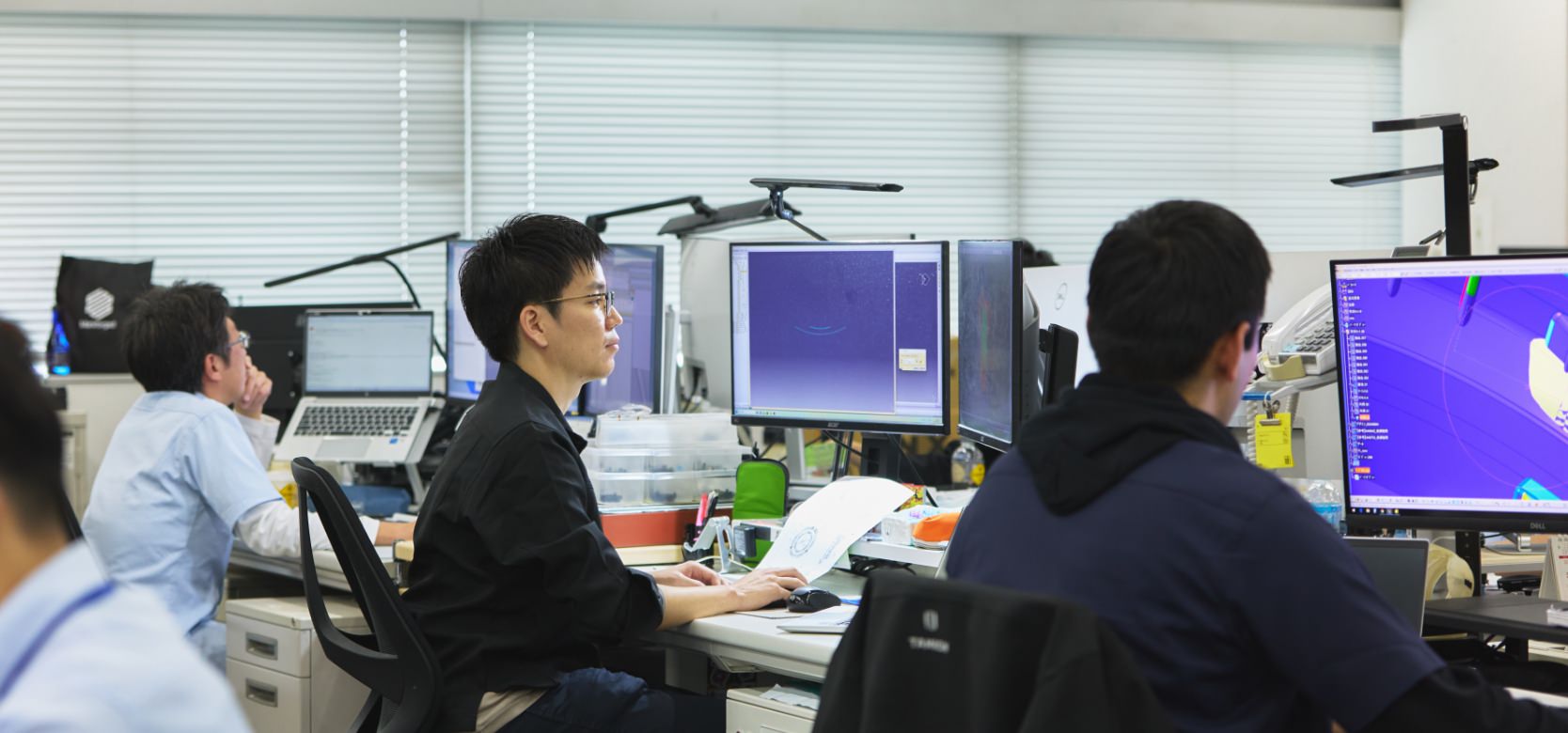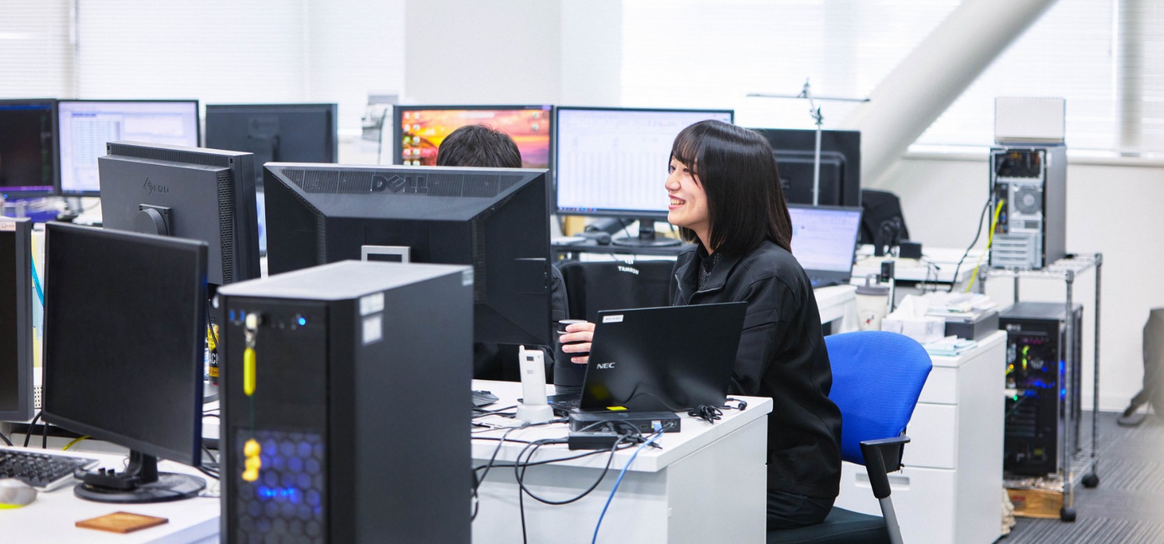 執務エリアはフロアが広く、他部署とのコミュニケーションが取りやすい環境です。タムロンでは社員一人ひとりに個人用デスクを割り当てており、PCのほかモニターを一人につき2台以上支給しています。