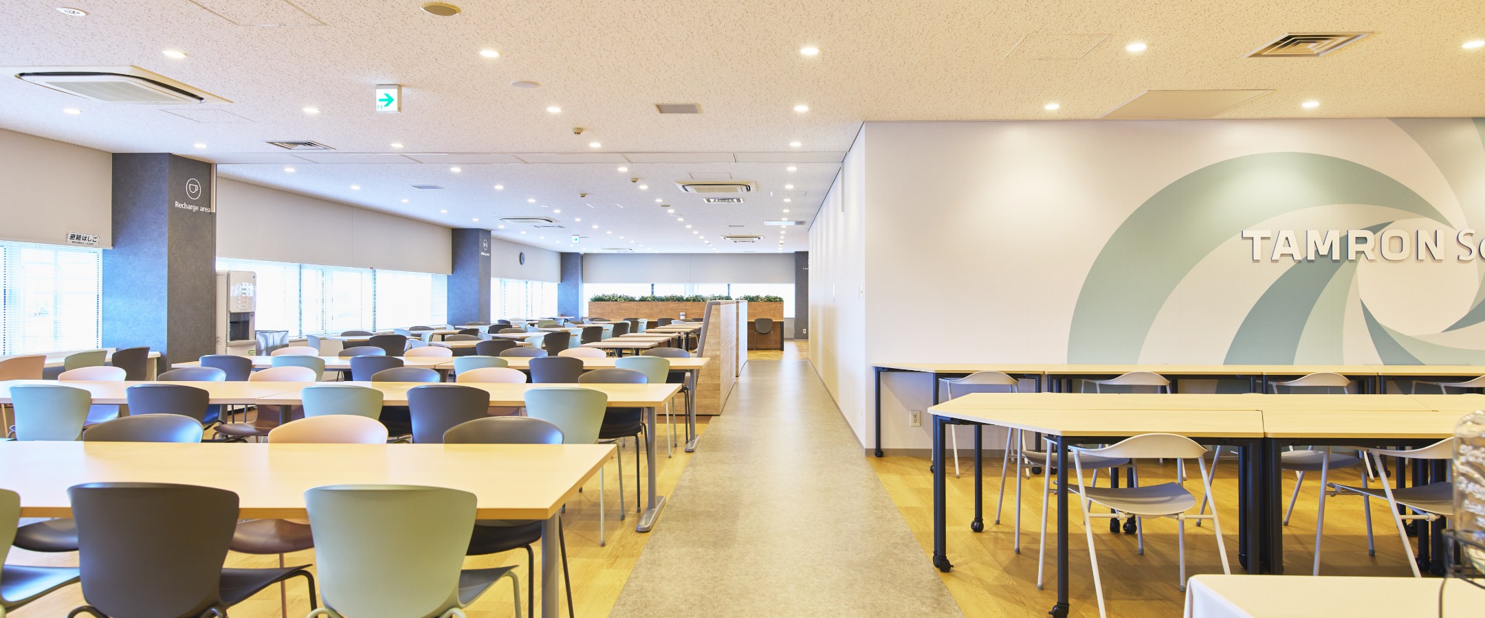 昼⾷時に飲食スペースとして利用できるだけでなく、デスクワークもできる場所となっています。休憩時間には社員同士のコミュニケーションの場として、また講演会開催などイベント会場としても活用しています。
